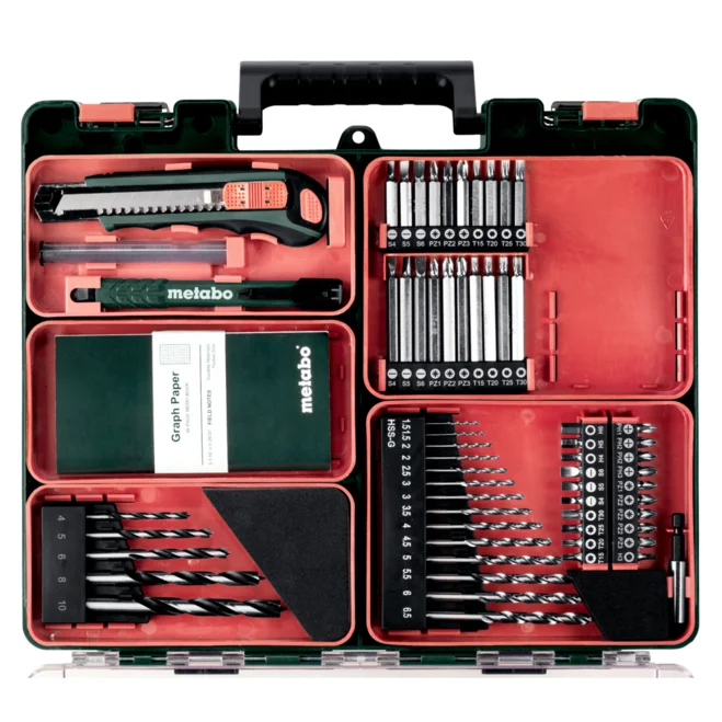 Mobilny warsztat: walizka z tworzywa sztucznego z bogatym wyposażeniem do wiercenia, wkręcania i innych zastosowań